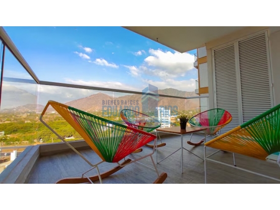 Este apartamento cuenta con dos habitaciones con baño privado, baño social completo, cocina americana, sala comedor y balcón con vista a las montañas.